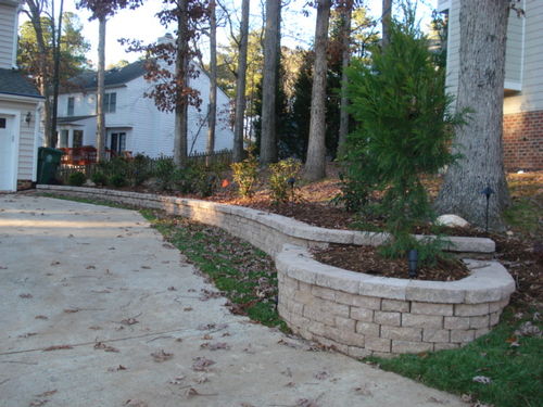 The customer wanted to change the hill next to their driveway to add a little better focal point. We decided that a retaining wall would not only help with erosion control but we could also backfill with plants to help the look. To top it all off we add a great set of outdoor lights to really help it standout at night.